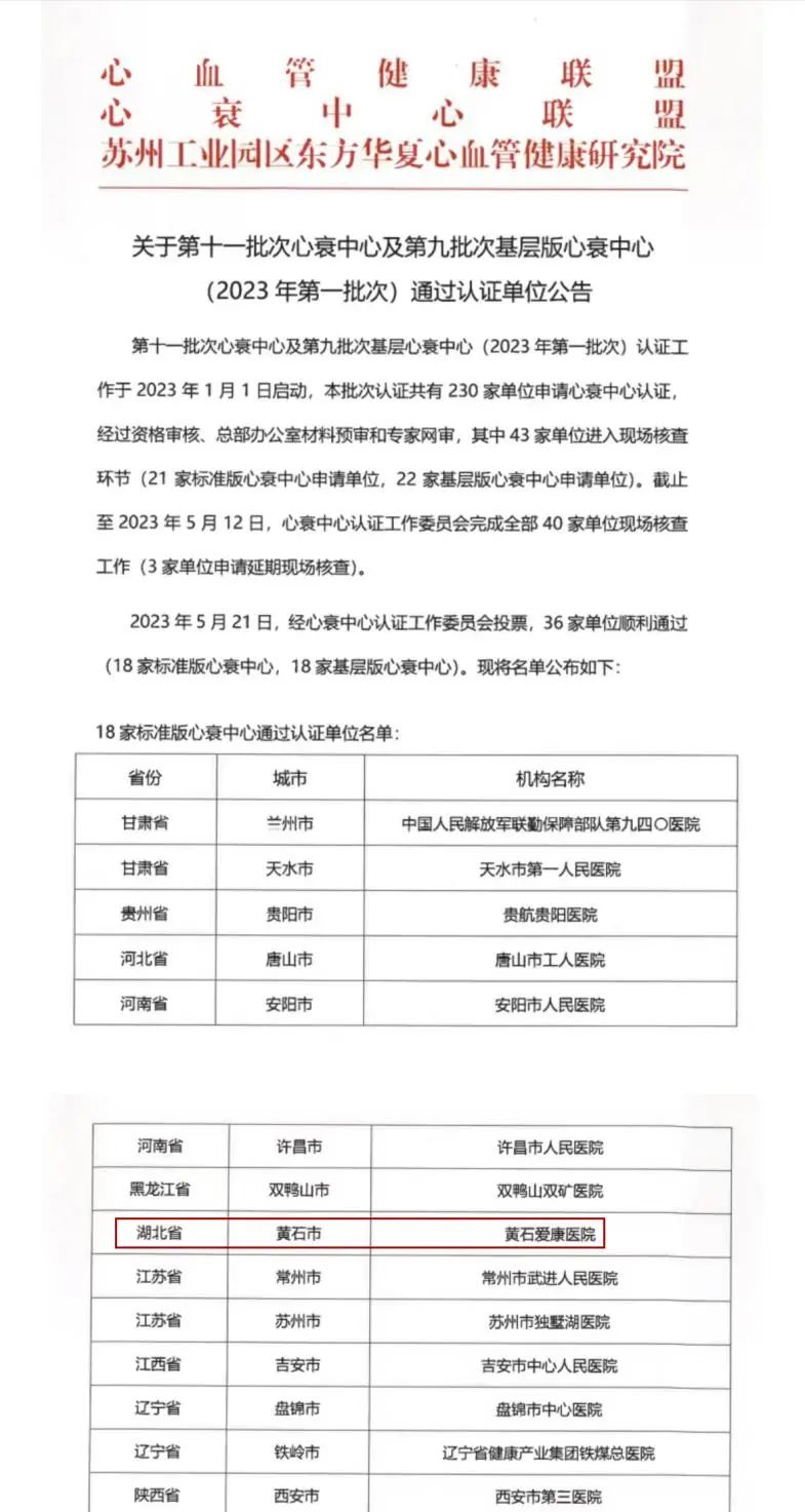2023年5月21日,中国心衰中心总部发布《关于第十一批次心衰中心及第九批次基层版心衰中心(2023年第一批次)通过认证单位公告》,经心衰中心认证工作委员会专家投票表决,黄石爱康医院心衰中心顺利通过国家标准版心衰中心认证。